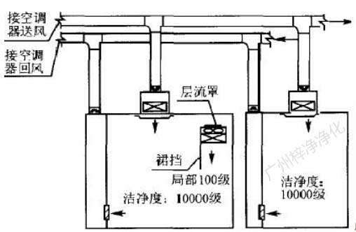 為了提高局部百級區氣流垂直層流效果,可以根據現場工藝設備高度及操作要求,適當降低局部百級區吊頂,或在潔凈區吊頂下直接拼裝 百級層流罩,并在百級區邊界處裝抗靜電塑料裙擋,如圖5。