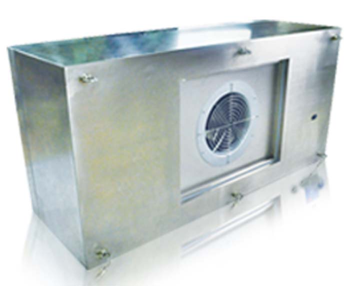FFU層流罩設有初、高效兩級過濾裝置。風機從頂部將空氣吸入并經初效過濾器、高效過濾器進行過濾,過濾后的潔凈空氣在整個出風口送出。安裝方式有懸掛式和落地支架兩種。